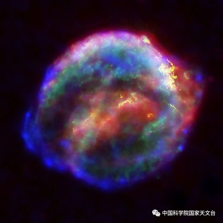 圖2. 由史匹哲太空望遠鏡、哈勃太空望遠鏡和昌德拉X射線天文台的圖像合成的開普勒超新星圖片(圖源:NASA)
