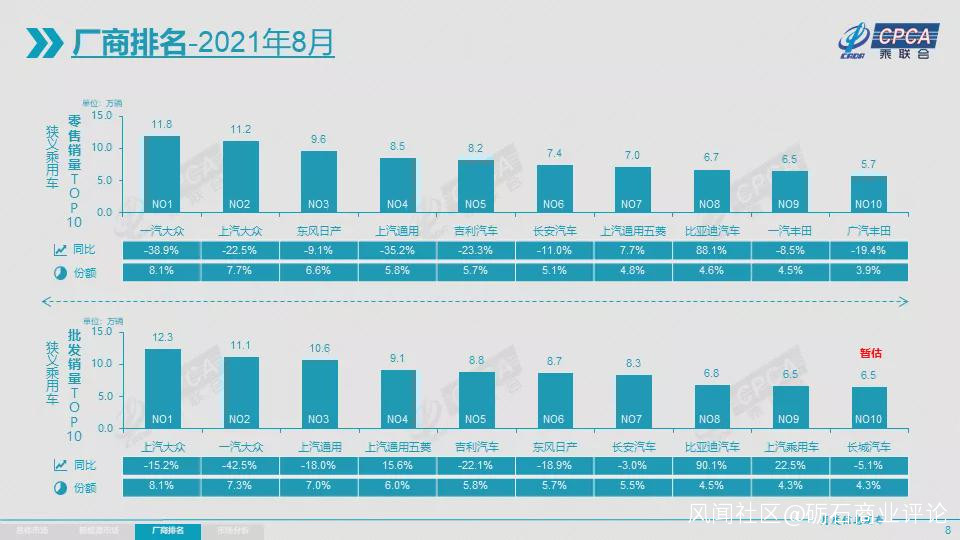 值得一提的是,8月中國新能源車企銷量排名TOP10之中,只有特斯拉一家外企,比亞迪、長城汽車、上汽乘用車、理想、小鵬等新老勢力繼續將合資品牌擋在10名之外,包括一汽大眾和上汽大眾兩家傳統巨頭。