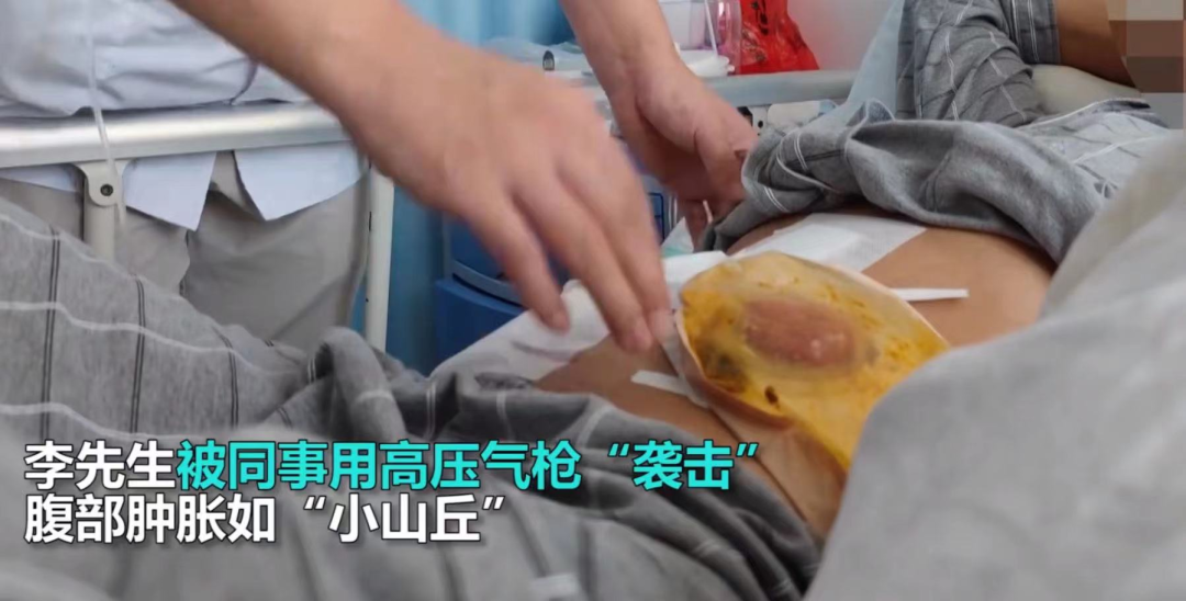 故事的情節大同小異,李師傅也是在工作的時候,被同事以玩笑的藉口突然用高壓氣槍對準了肛門處充氣。