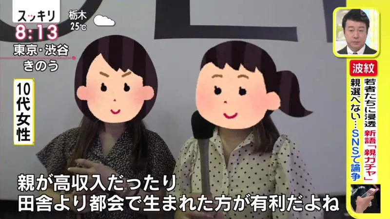 朝日電視台最近做了一期關於“父母扭蛋”的節目。節目組在街上採訪了一個年輕的女性,她認為“父母扭蛋”這種説法很有道理:“我出生在一個貧困家庭,父母沒有錢供我讀書,所以我很早就走入社會,找了份工作來打工賺錢。”