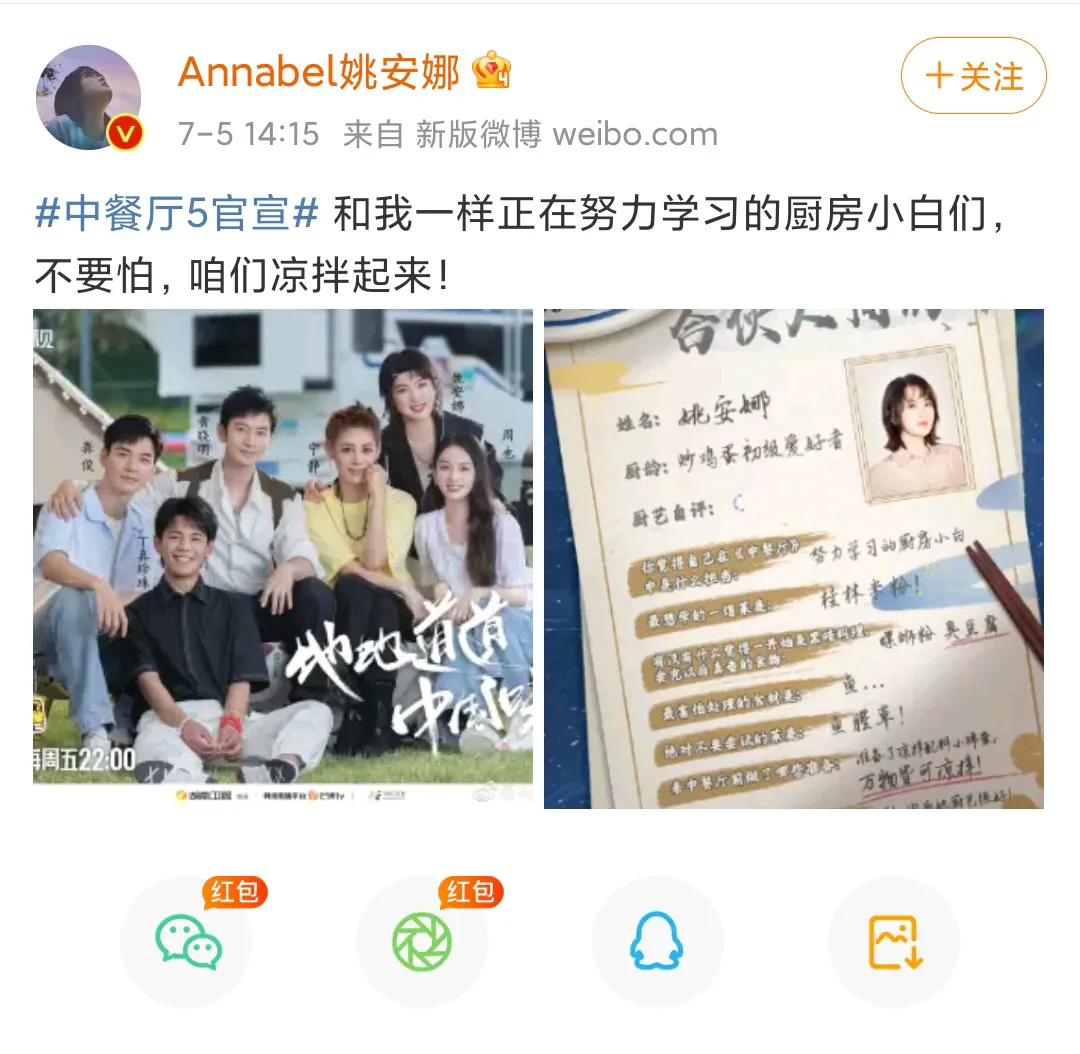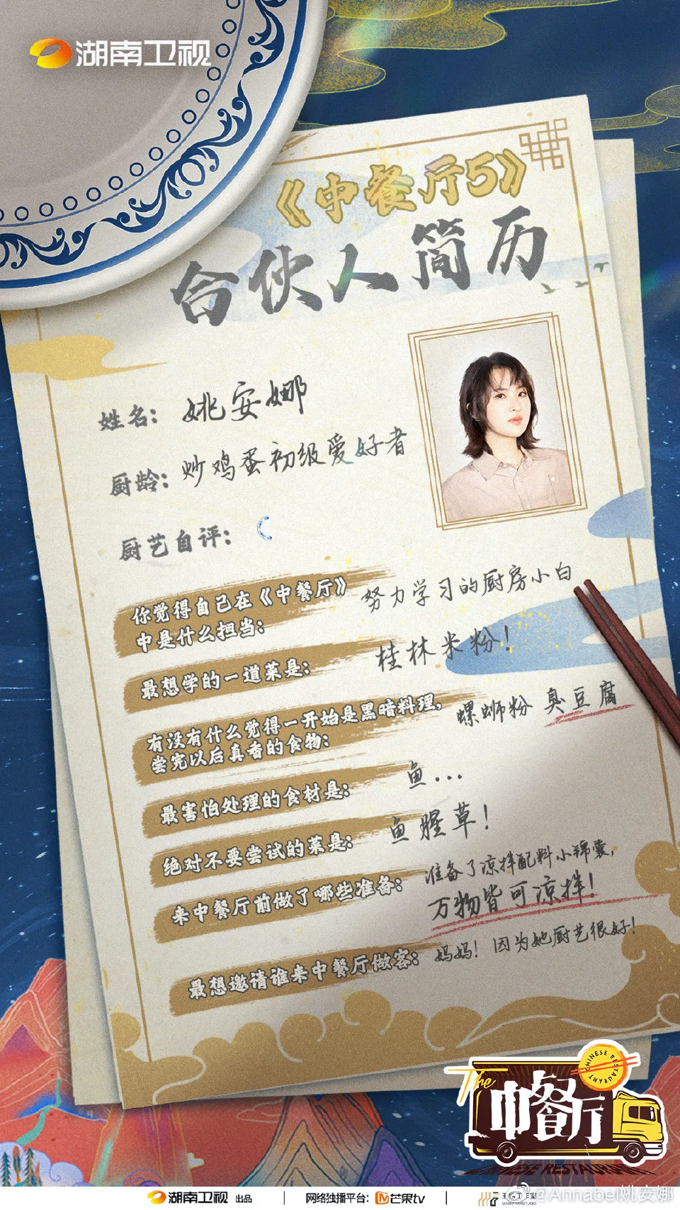 7月5日,姚安娜官宣參加綜藝節目《中餐廳第五季》的錄製。