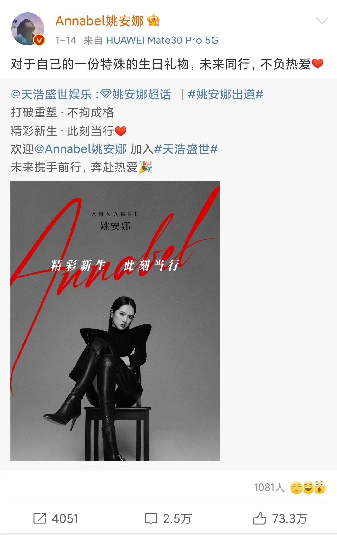 1月10日,姚安娜簽約天浩盛世,1月14日,姚安娜23週歲生日當天,官宣出道,以中國內地女歌手的身份,正式進入娛樂圈。