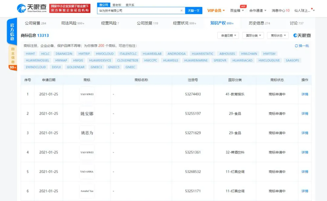 據天眼查顯示,1月25日,華為技術有限公司新增多條“姚安娜”“姚思為”“YAO ANNA”“YAO SIWEI”“Annalbel Yao”的商標信息,國際分類涉及教育娛樂、機械設備、科學儀器等。