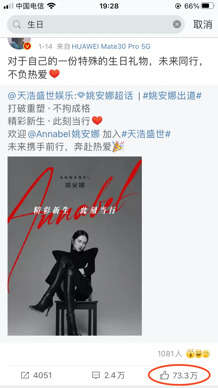 姚安娜官宣出道時,點贊量高達73.3萬。