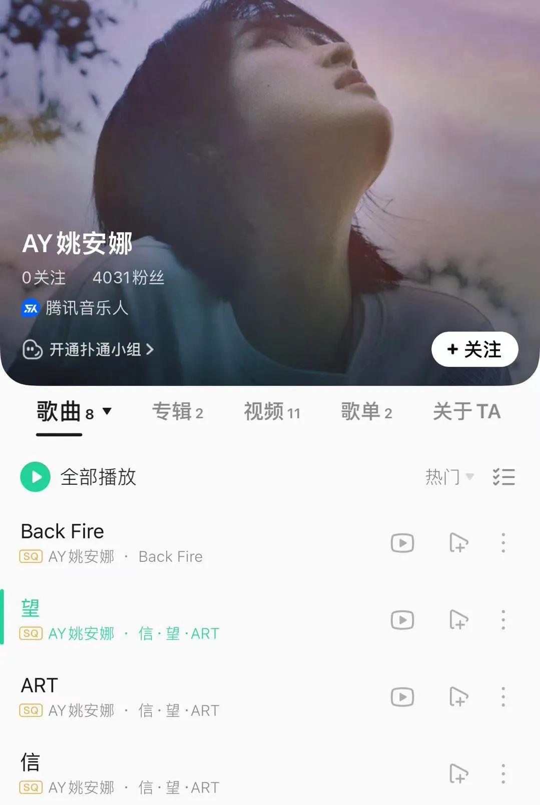在QQ 音樂裏,姚安娜也只有4031個粉絲。