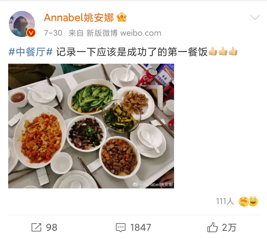 7月30日,《中餐廳第五季》開播,姚安娜在微博曬出了自己做“成功”的第一餐飯。