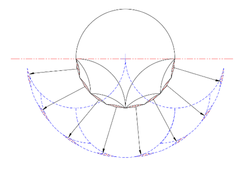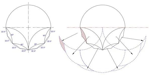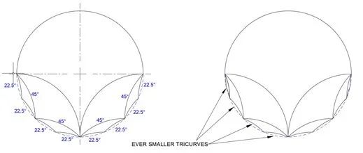 這兩例都用了七個三曲線,只是排列方式不同,兩種情況下頂部的三曲線都是 22.5°-157.5°-180° 。同時,以上三種填充方式,未填充的下半周的鏡片數量和尺寸都相同,恰好是八個 22.5° 的鏡片,這些鏡片也最終會用無限的小的三曲線來進行填充。