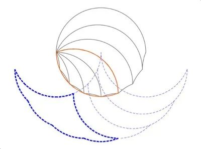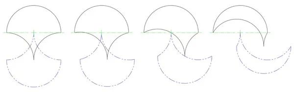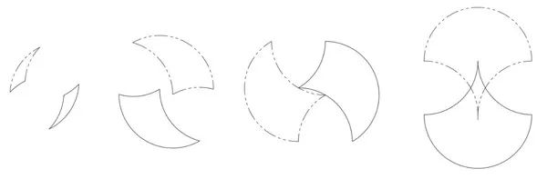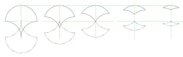 鏡片是一種最簡單的幾何形狀,它由兩條相同的弧線拼接而成,假設弧線的半徑為 1 ,鏡片就可以簡單得用弧的角度來描述。在弧線上取一點,將弧線分成兩部分,然後每部分都可以製作一個鏡片,從大的鏡片裏面減去兩個小的鏡片,就會得到一個不同尋常的三曲線的形狀。