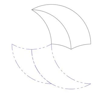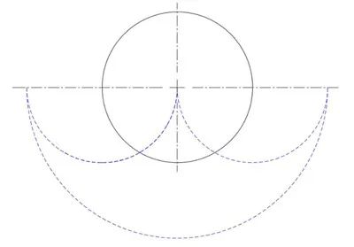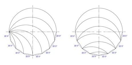 或者,可以將三曲線最小的弧角保持為 22.5° ,利用從同一點出發的圓弧(圖十四左),或者大的三曲線交錯的形式(圖十四右)來完成填充。