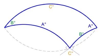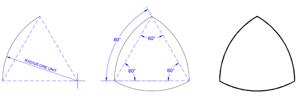 一個簡單的例子是由等邊三角形的頂點構成的曲邊三角形(Reuleauxtriangle)(如圖一所示)。依次將圓規頂點放在三個頂點上,然後繪製連接剩餘兩個頂點的圓弧,這樣便得到了三段圓弧組成的曲邊三角形。三條弧所對應的圓周角都為 60° 。曲邊三角形是唯一一個邊由弧形構成,且弧形的中心為頂點的曲邊形狀。