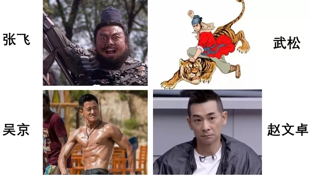 陽剛之氣以人為載體。傳統陽剛代表人物有張口喝斷當陽橋的張飛,亂拳打虎景陽岡的武松,大威天龍雷峯塔的趙文卓,以及萬能出拳表情包的吳京。他們的共同特點是能狂、能怒、會武術