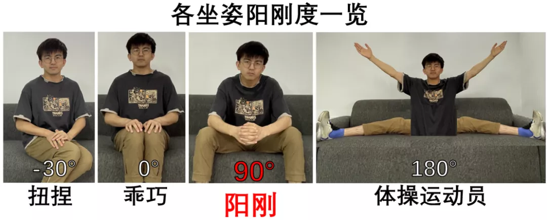 陽剛往往體現在一些不經意的小地方。比如平時的坐姿,**雙腿擺放的角度決定了你看世界的態度。**我這裏有份坐姿角度示意圖,大家可以參考參考
