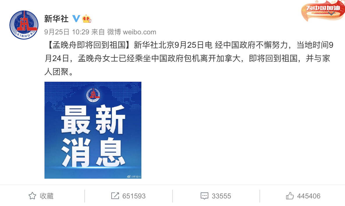 經過中國政府的不懈努力,孟晚舟女士即將回到祖國。