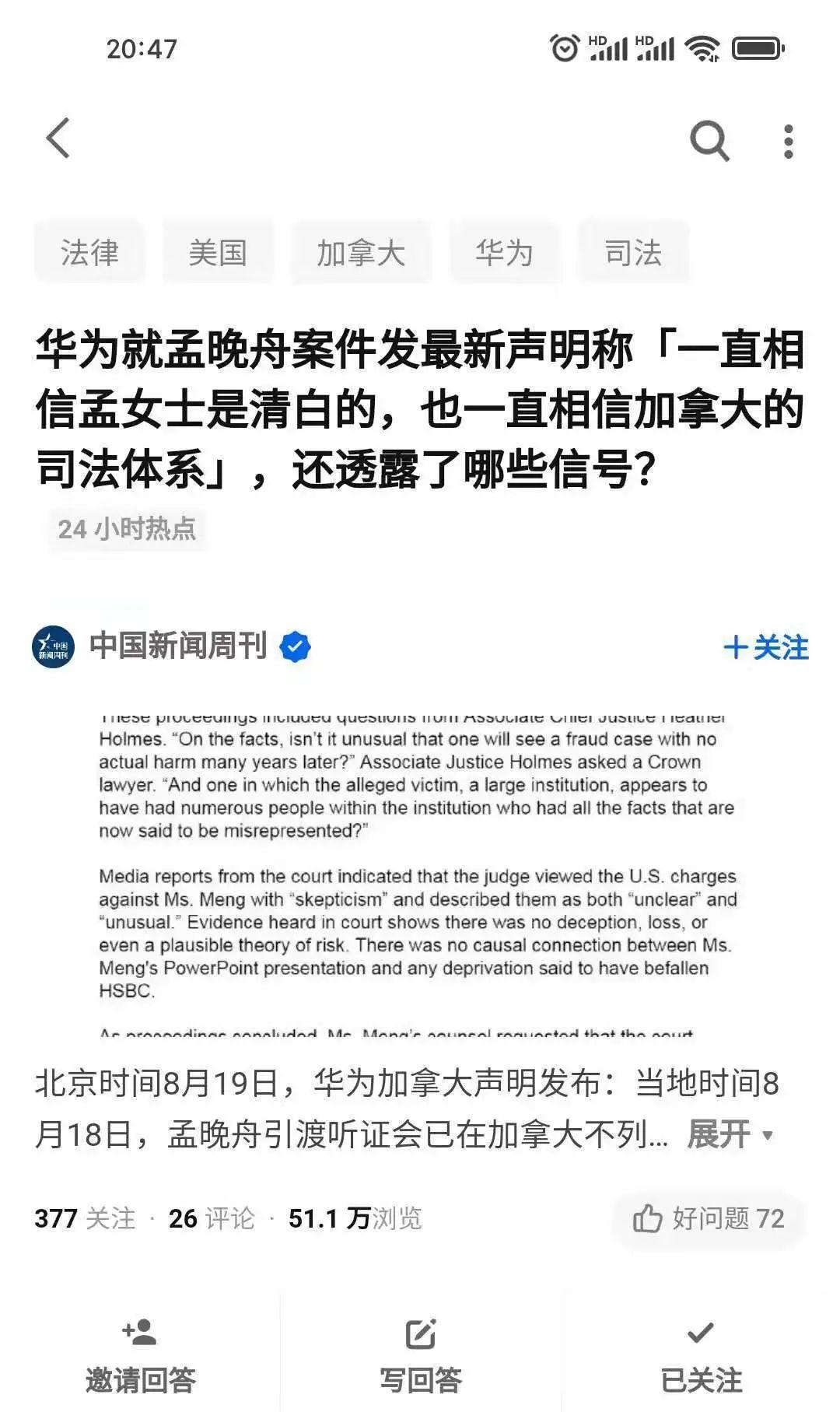 華為就孟晚舟案件發最新聲明稱“一直相信孟女士是清白的,也一直相信加拿大的司法體系”。