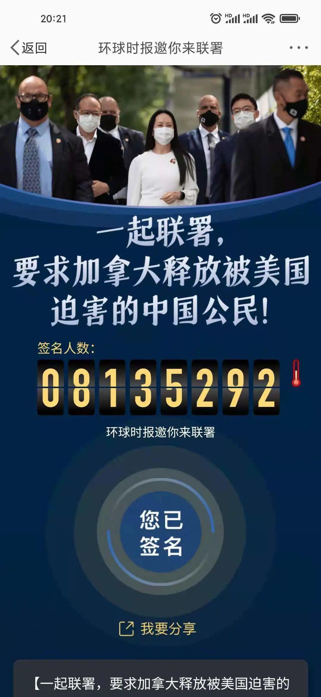 目前已超過800萬人要求加拿大釋放孟晚舟。