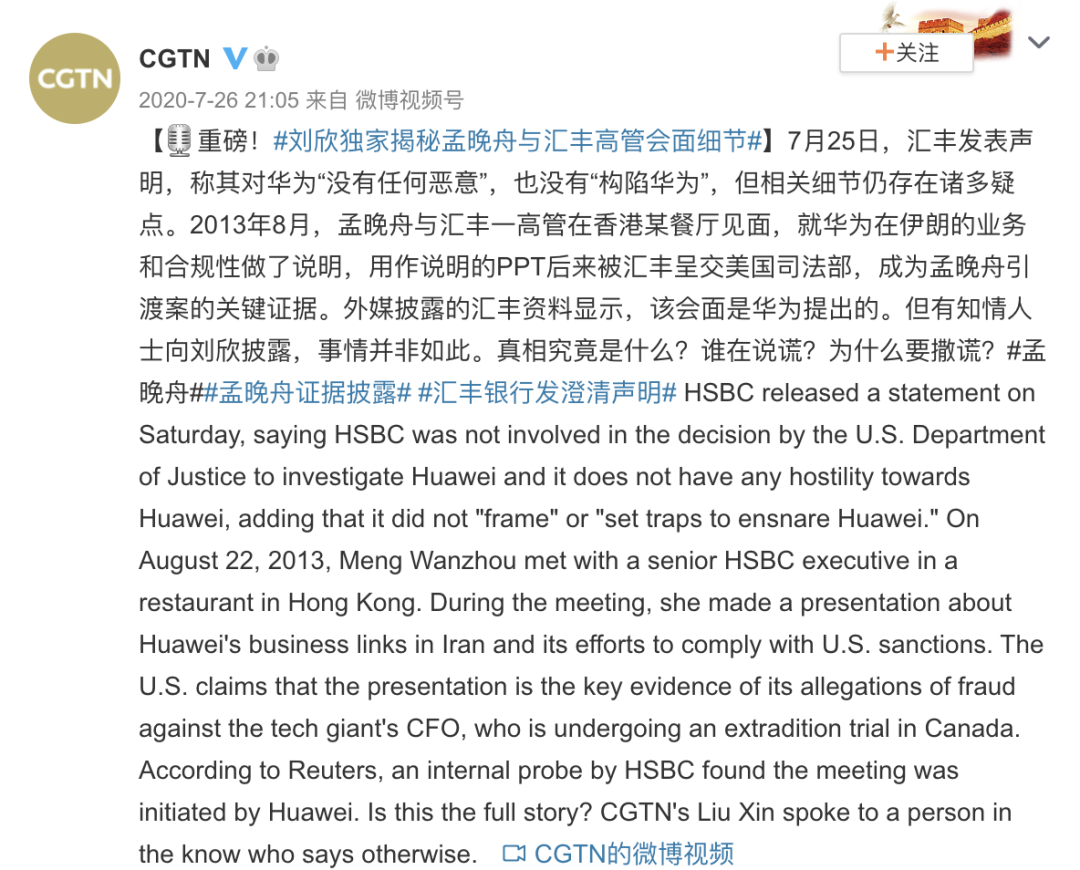 中國國際電視台官方微博CGTN發文揭秘孟晚舟和滙豐高管會面細節。