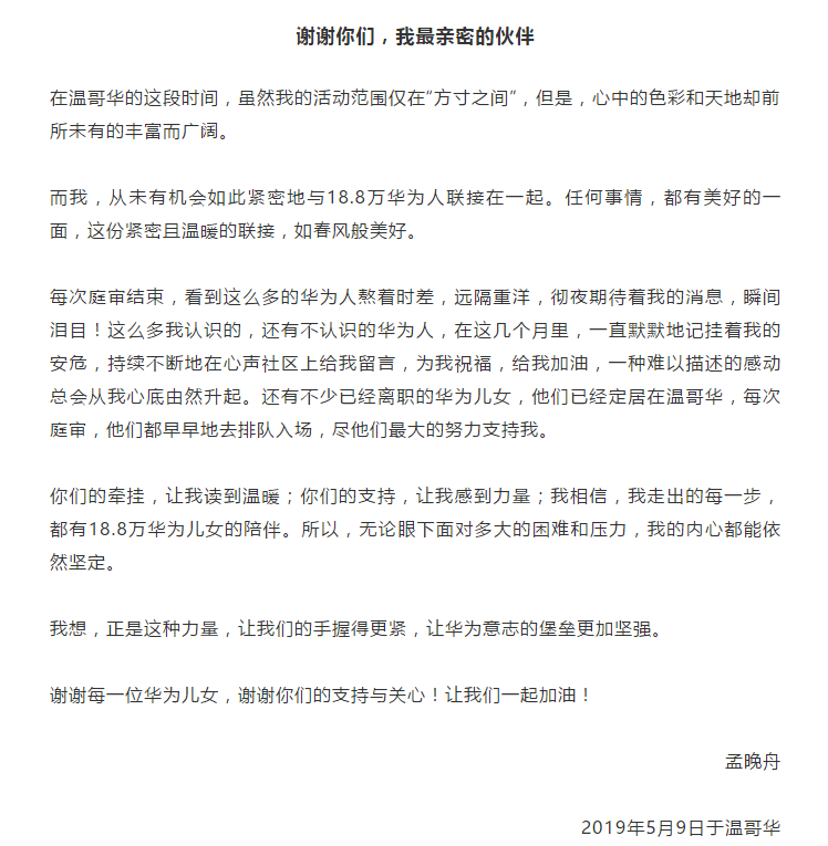 華為心聲社區發佈了孟晚舟5月9日給所有華為人的一封信。