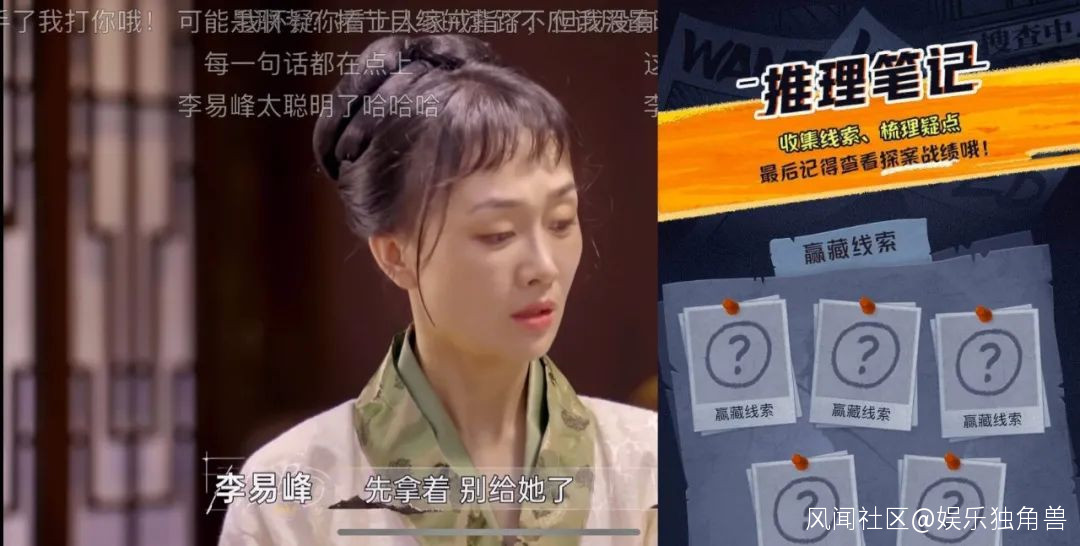 這種代入感又分為兩層:**其一是劇情式推理帶來的。**李易峯通過微表情判斷挑夫夫人有異,彈幕上的網友同樣get了這一點;他找到被丟在角落裏的帕子、通過“看手相”拿到的關鍵鑑毒器具銀戒,也讓網友大呼“細心”“機靈”。——他的“入戲式推理”其實也在帶動着觀眾走進劇情,這也是劇式綜藝的一大突破。