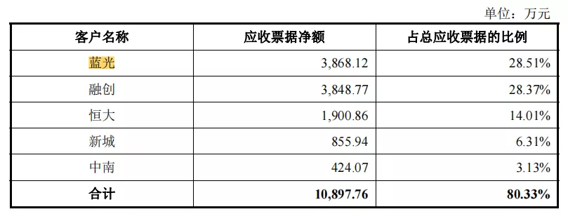 具體來看,公司應收賬款、合同資產以及應收票據金額前五名客户金額合計近2.4億,佔相應科目合計金額比例為48.64%,其中,藍光應收賬款、合同資產以及應收票據各類款項金額合計9203萬元。