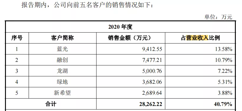 2020年,公司的前五大客户分別是藍光、融創、龍湖、綠地和新希望,均為國內龍頭房企。報告期內,公司的第一大客户均為藍光。