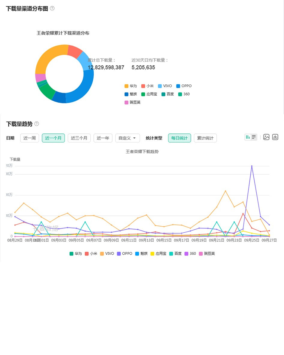 從移動產品商業分析平台七麥數據監測統計的數據能夠看到,王者榮耀作為國內最火的手遊IP,累計下載渠道分佈的前三分佈是華為、OPPO及vivo三個渠道,應用寶則排名第四,距離處於頭部的華為、OPPO差距顯著。