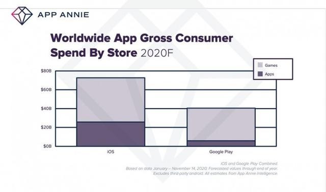 由市場調查機構 App Annie 的統計報告顯示,無論是iOS還是Android端,遊戲收入佔據了總收入70%以上的比例,平均每1美元支出中約有71美分是用於遊戲上。