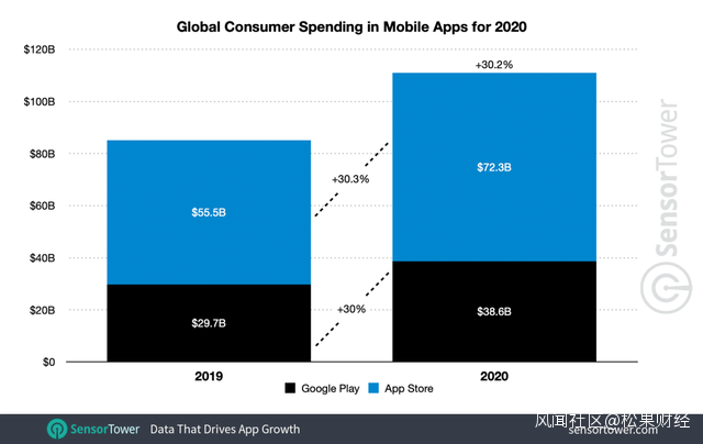 現如今蘋果App Store與Google Play為全球最大的兩家應用商店平台。Sensor Tower統計數據顯示,2020年全球消費者在這兩個市場上的支出總額達到近1110億美元,其中App Store的總收入約是Google Play的兩倍。