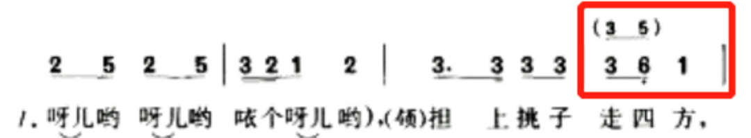 隨後的旋律中,出現了非常多具有山東方言山歌特點的轉音。其中一些高音的上揚,也是和吆喝的形式重合的: