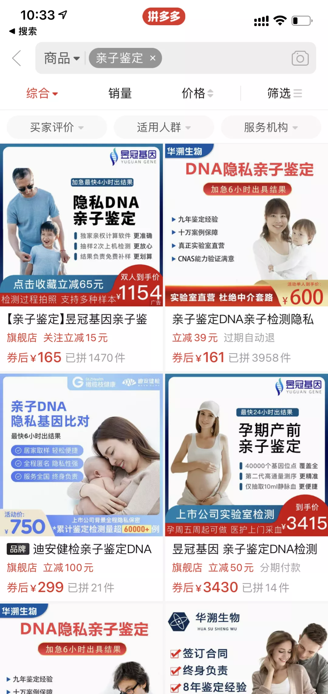 拼多多上熱銷的親子鑑定套餐,只是這門生意越來越好的一個小小縮影。不只是拼多多,大多主流電商平台都出現了鑑定機構,為用户提供私密的親子鑑定服務。