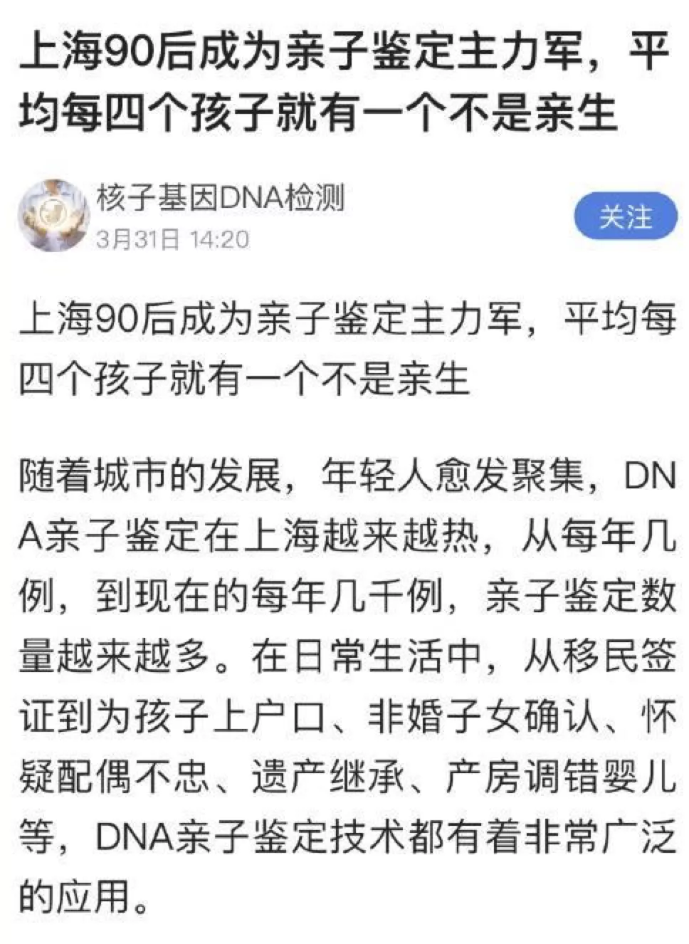 前段時間,一家上海基因檢測機構發文稱,如今在上海,90後已經成為親子鑑定的主力軍,從檢驗結果來看,平均每四個孩子就有一個非親生。