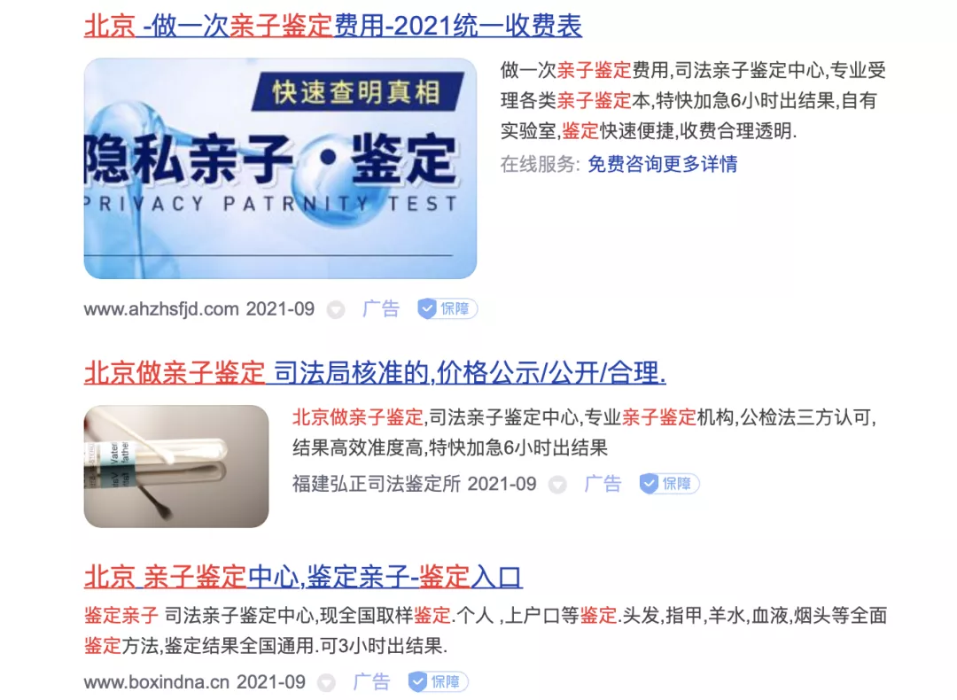 傳統的親子鑑定機構大多把店面開在線下,通過線上網站排名等方式引流,用户搜索諮詢後到店檢測。畢竟算是隱私行業,機構也不太可能去街上發傳單拉客户。