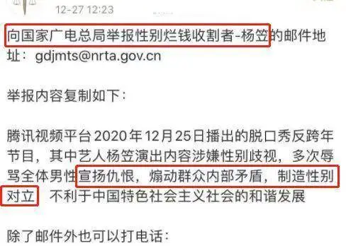 同樣的,抱有對異性仇恨的男性也大有人在。脱口秀演員楊笠因為一句調侃男性“那麼普通,卻又那麼自信”成為了當之無愧的紅人,許多女性都很認同她在脱口秀段子中關於兩性關係的吐槽,但同時還有相當一部分男性對此不滿,認為她在攻擊男性,是在挑起性別對立並以此做“女權”生意。而隨着性別對立的矛盾在網絡上越來越頻繁地出現、加深,那些仇女的男性選擇報復回去,他們報復的對象則是楊笠。在一些男性用户集中的論壇、貼吧等社羣中,他們會不斷對楊笠及其粉絲進行辱罵,楊笠代言、做廣告的商品他們會奔走相告提醒大家抵制,並且集中去要求商家開發票,他們認為這種行為將會給商家帶來困擾,並且找到客服提出對代言人的不滿等。這彷彿是一場網絡大戰,然而對戰的雙方本不應該為敵。