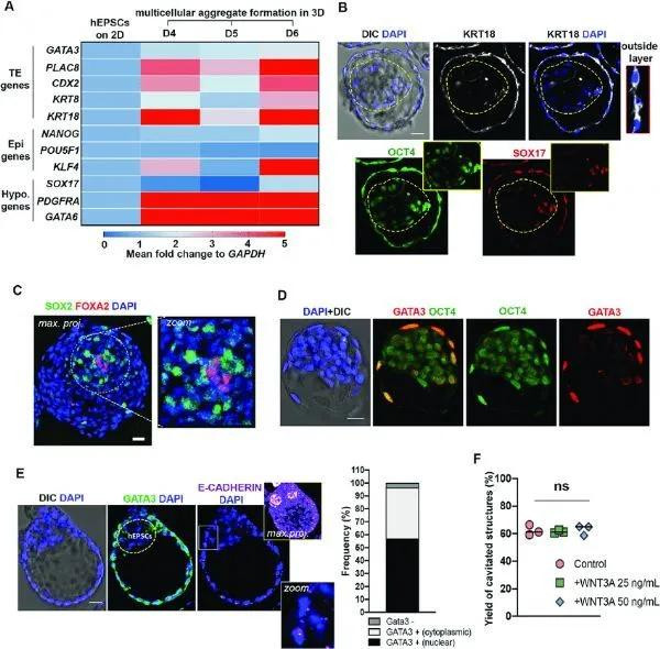 研究人員在3D培養基平台中評估了hEPSCs模擬早期胚胎細胞命運的多分化潛能。結果表明,研究人員所建立的基於hEPSC的系統能促進hEPSCs自組裝為在形態上與人類囊胚和植入期周圍胚胎有一些相似之處的結構,並在一定程度上具有譜系規範。然而他們也發現,其細胞譜系組成並不是完善的,這些細胞主要會採用一種中間的轉錄狀態。