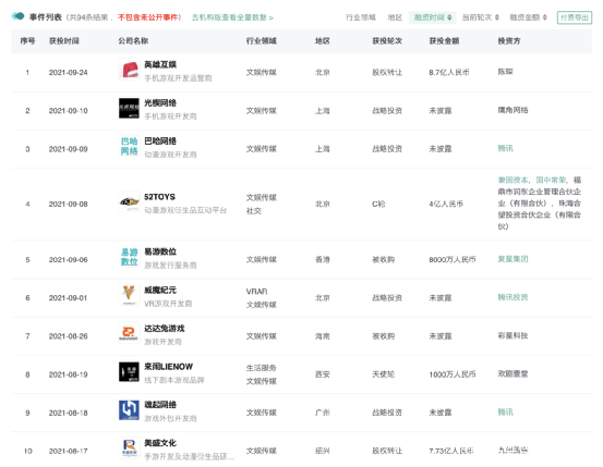 在國內也是如此,據烯牛數據顯示,2021年遊戲行業共發生了93筆公開融資事件,這個數字已經超越了2020年全年國內遊戲行業的融資事件總數(87件)。遊戲公司開疆拓土、大肆併購擴張融資版圖,似乎已經成為了遊戲行業發展的新路徑和趨勢所在。