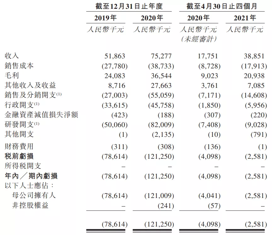 在上述同期內,公司的虧損淨額7861.4萬元、1.21億元、409.8萬元、258.1萬元,公司絕大部分的經營虧損來自與公司持續經營有關的研發開支、銷售及分銷開支、行政開支。