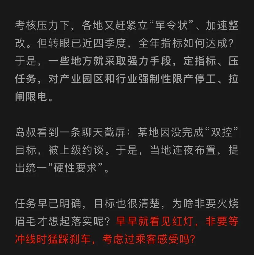 人民日報的文章其實已經説得很清楚了,第一是大宗商品被熱錢拱起來了,於是一些企業就開始蠢蠢欲動,擴張產能,這是要消耗能源的;第二是我國疫情控制得比較好,海外訂單都飛過來了,工廠開足馬力,這也是要消耗能源的。當然,最重要的原因是,有一些地區,在2030年碳達峯的目標之前,希望能趕快上馬一些兩高項目,所謂兩高,就是高耗能、高排放的項目,為了坐實,先建再批。但「能耗雙控」的政策就擺在那,這相當於前面把額度都用完了,到了年底了,上面要檢查了,於是緊急剎車,不僅兩高的項目停了,一大批中小企業都給限電了,據説某個地方因為雙控落實得不好被約談,第二天就直接給下面的企業提出硬性要求。