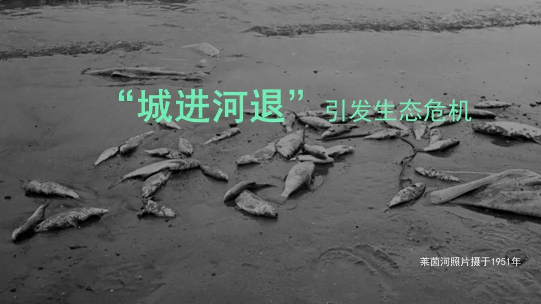 但好景不長,改建後的河流流速加快、洪澇加劇,很多地區退化為三面光的渠道。加上工業污染,大家看到這張照片就是上個世紀50年代的照片,曾經最美麗的萊茵河蜕變為歐洲最髒的下水道,生物幾乎絕跡、城進河退、引發了生態危機。