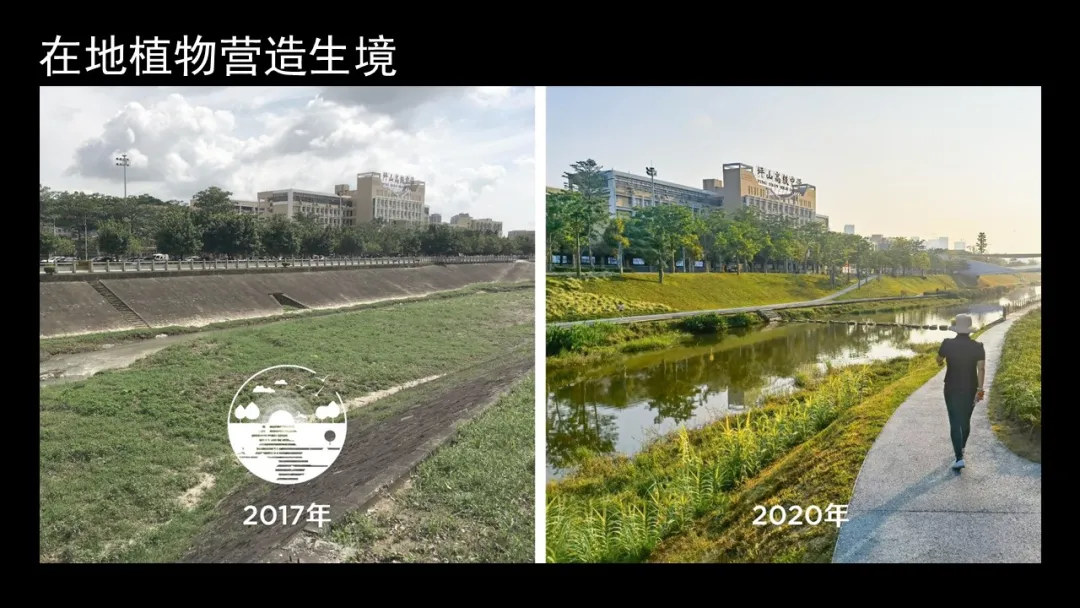 針對僵死的三面光河道,我們選擇當地的適水植被來為河牀和河底穿上綠色的衞衣。既降解河流的污染,又為魚類、水禽類提供了可以棲息的家。隨着水質的改善,這些動物種類越來越多,構成了未來韌性豐富的生態羣落。