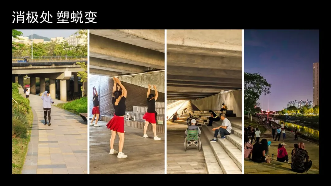 在市政基礎設施造成的消極空間,我們通過藝術設計,增加照明、座椅和舞台等設施,讓曾經的黑暗之地變成了日常文體活動和節日慶典的歡樂場所。