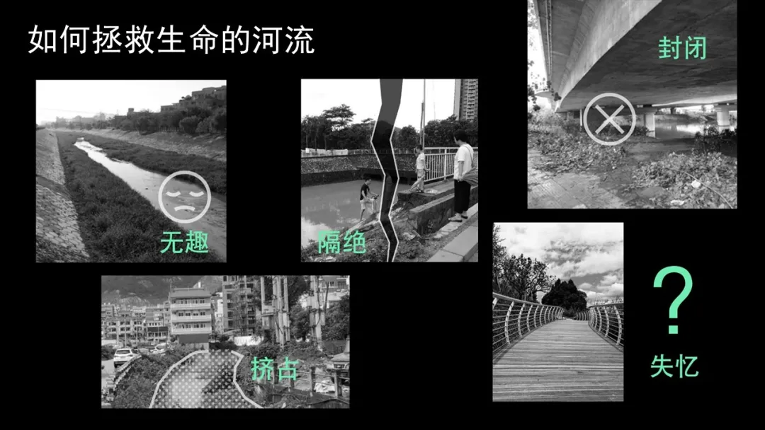 大型市政設施和過度超尺度的景觀建築,割裂了生活與河流的關係。曾經的母親河變為幽閉、黑暗、無趣的危險之地,河流因為城市發展而生病,我們需要如何拯救?