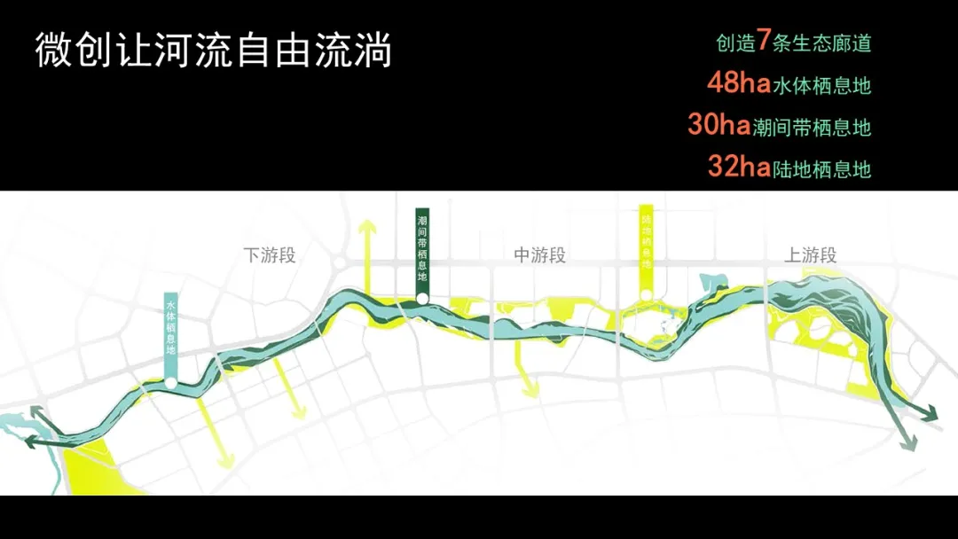 首先針對環境污染和空間受限的挑戰,用技術比較方案説服相關利益方,後退濱河的交通、減少和騰退侵佔河道的停車場,還寶貴的空間資源給綠化空間,形成立體梯度的生態系統。改建後的生態系統比之前增加了三倍,有效地改善當地的微生境,並且創造了曼妙豐富的空間序列。