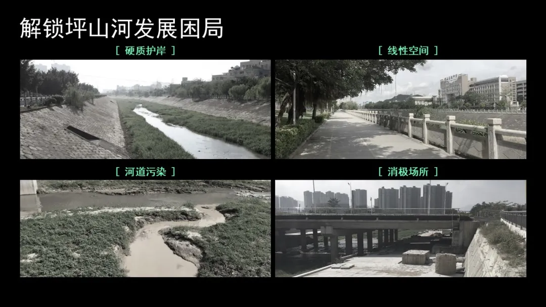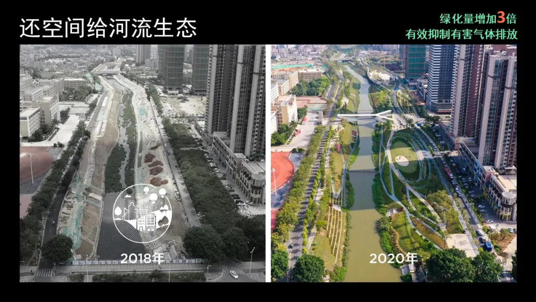 2018年,我們在深圳坪山河項目考察時,發現河道周邊污染嚴重,臭氣熏天、人跡罕至,跟深圳東部副中心區定位相距甚遠,我們和當地政府密切合作制定了相關模型,進行了生態保育的恢復模擬,共同制定了生態功法的再生實踐計劃。