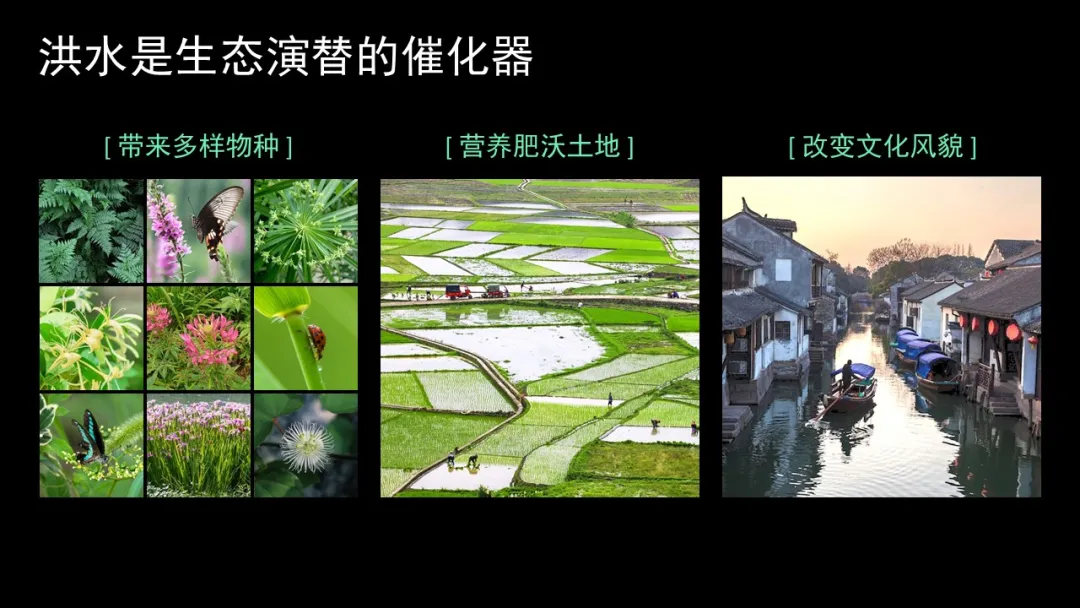 針對洪水,從生態學角度,洪水是自然界生物能量的傳遞過程,沒有洪水就沒有流域間生物多樣性的基因的傳遞;沒有洪水,就沒有沿途肥沃的土地;沒有洪水,就沒有沿河獨特的文化景觀風貌;因此借鑑古人趨利避害、順疏導滯的經驗,在今天如何善用洪水、考驗當代人的智慧。