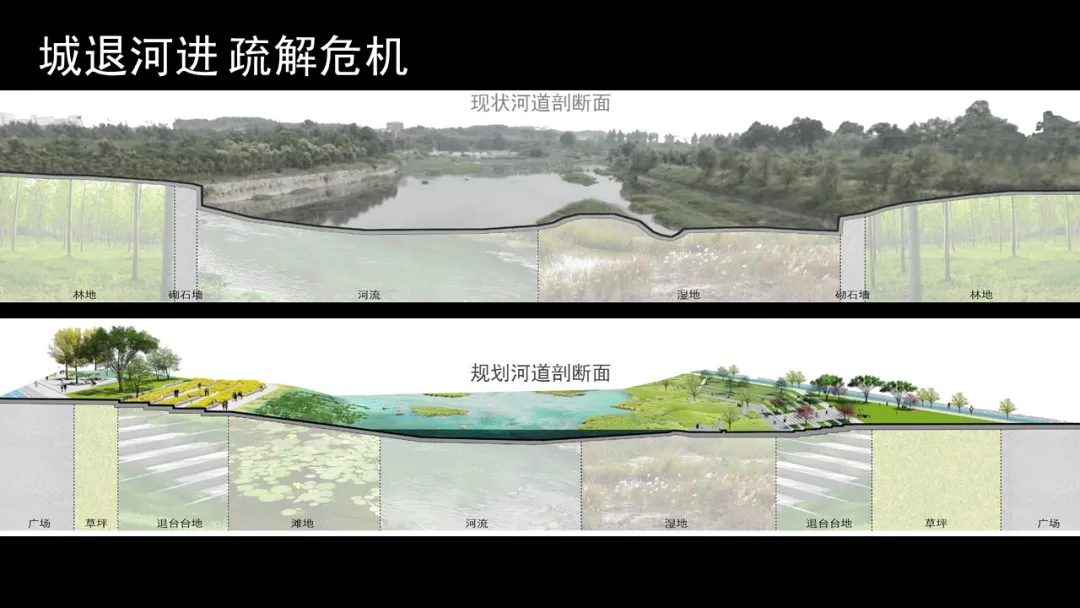 經過與當地政府的反覆溝通,制定了以微創設計為核心的河流再生實踐。我們在河流上游儘量保留河流的自然狀態,保留河流的蜿蜒和舒展,騰退養殖場用地,建設森林濕地和農田;在中游城鎮化地區對已經破壞的沿岸地區拓寬河道,改善生態湖岸,舒緩洪水的壓力;在河流下游,騰退貼河而建的工業用地,建設綠地和垂河廊道,在整個河流系統因地制宜,構建藍綠交織整體的生態共同體。