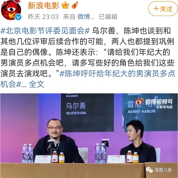 原因是他在北京電影節的媒體見面會上,抱怨年紀大的男演員戲約不夠,請大家多寫些好的角色給他們,讓他們去演戲。