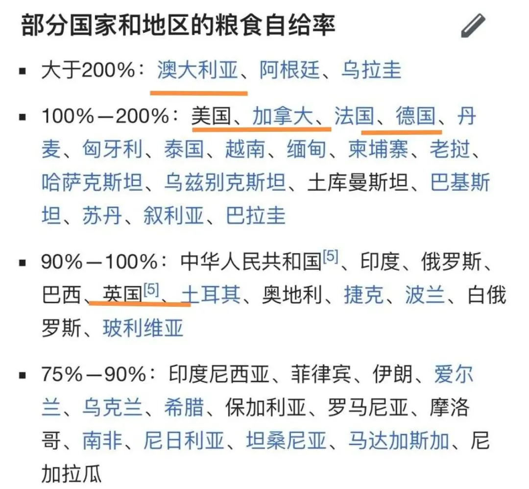 上圖是國際糧食署劃定的各個國家糧食自給率。不難看出,五眼聯盟和被其反覆拿捏的主要歐洲國家,在糧食產量和自給率上,明顯佔據優勢。前面雞肉事件,實際上也表明了美國拿食品操控其他國家的實力。