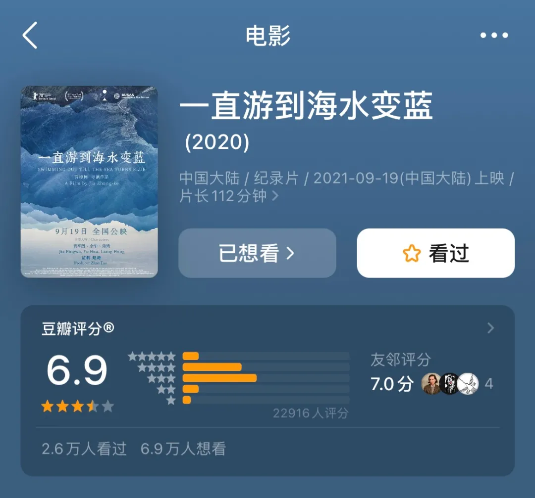 可這一次,《一直游到海水變藍》卻創下了賈樟柯電影在豆瓣上的評分新低:
