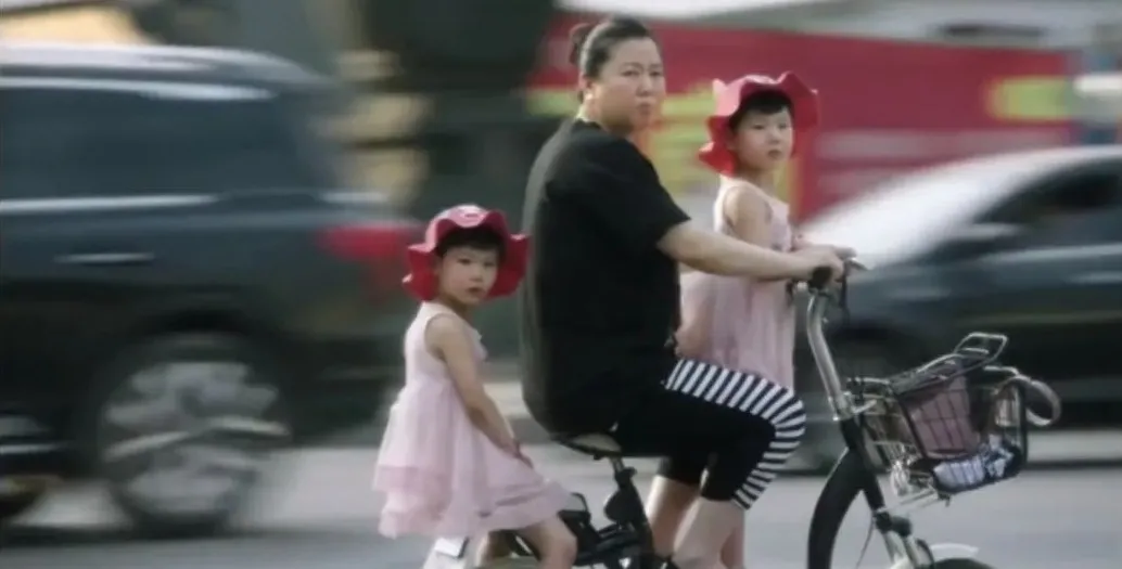拍蹬着自行車一前一後載兩個女兒的母親: