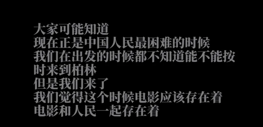 “大家都知道,現在正是中國人民最困難的時候,我們在出發的時候都不知道能不能按時來到柏林,但是我們來了。我們覺得,這個時候電影應該存在着,電影和人民一起存在着。”