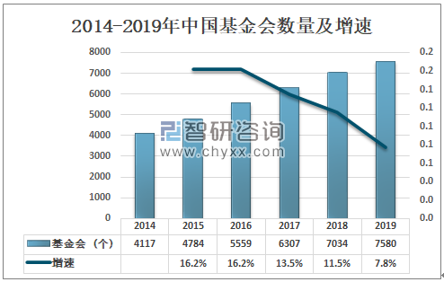 截至2019年,中國慈善基金會的數量達到7580家,其中公募基金會1910家。